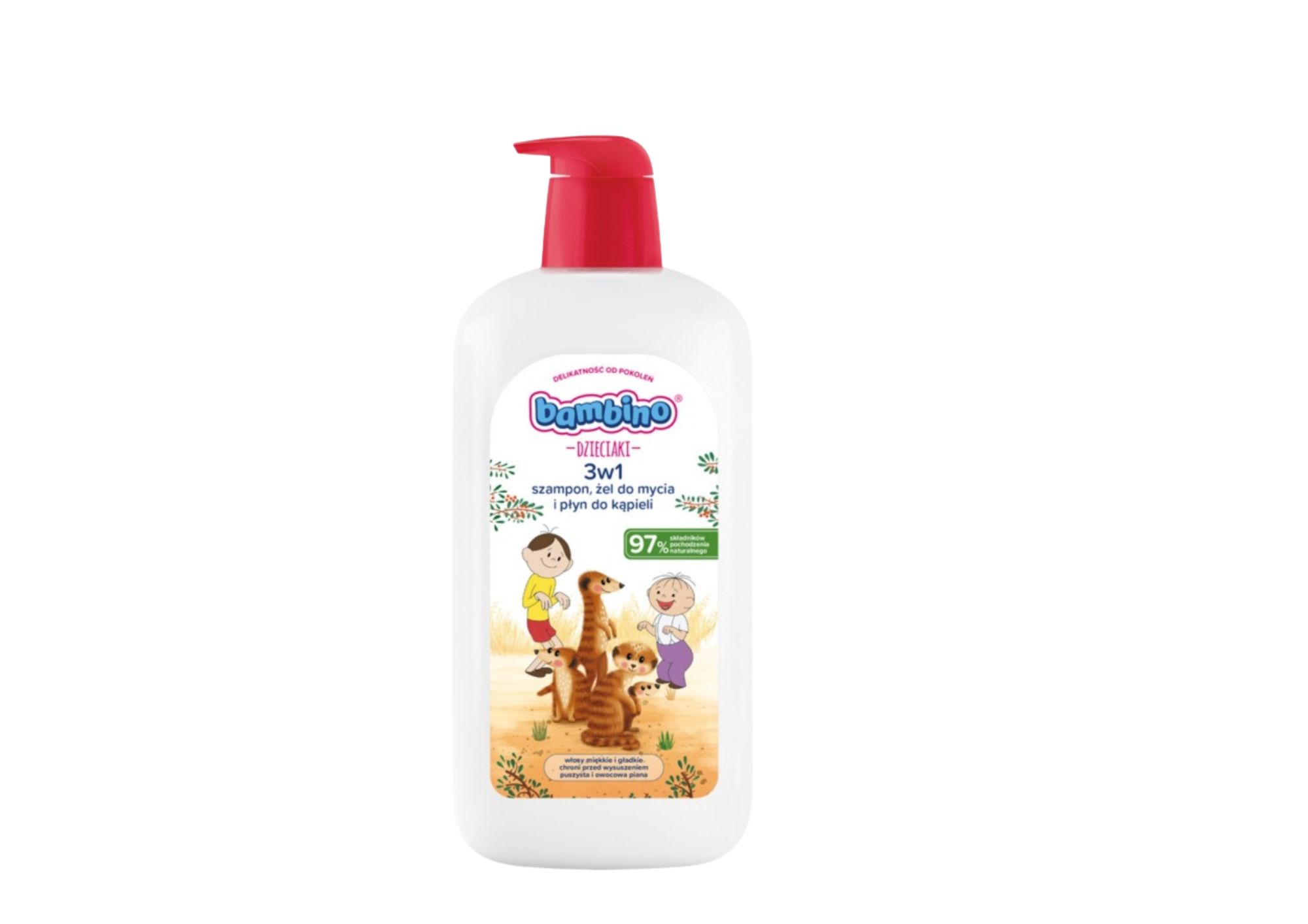Duża pojemność 1000 ml sprawia, że produkt jest wydajny i idealny do codziennego użytku. Kolorowa grafika z motywem surykatek zachęca dzieci do kąpieli i zamienia ją w przyjemny rytuał.