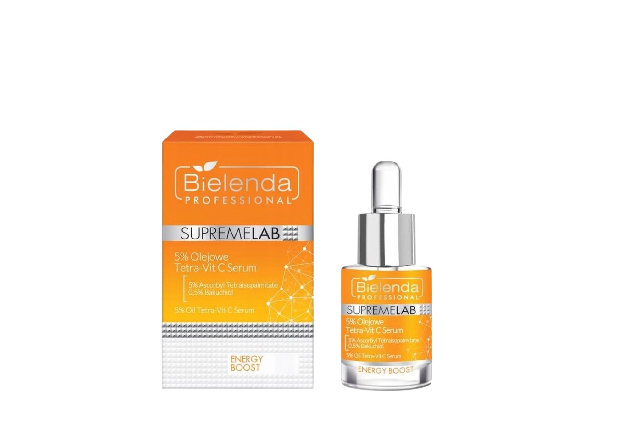 Bielenda Professional SupremeLab Energy Boost – olejowe serum z 5% Tetra-Vit C (15 ml) to skoncentrowany kosmetyk o działaniu rozświetlającym i regenerującym, przeznaczony do pielęgnacji skóry wymagającej wyrównania kolorytu i odżywienia.
