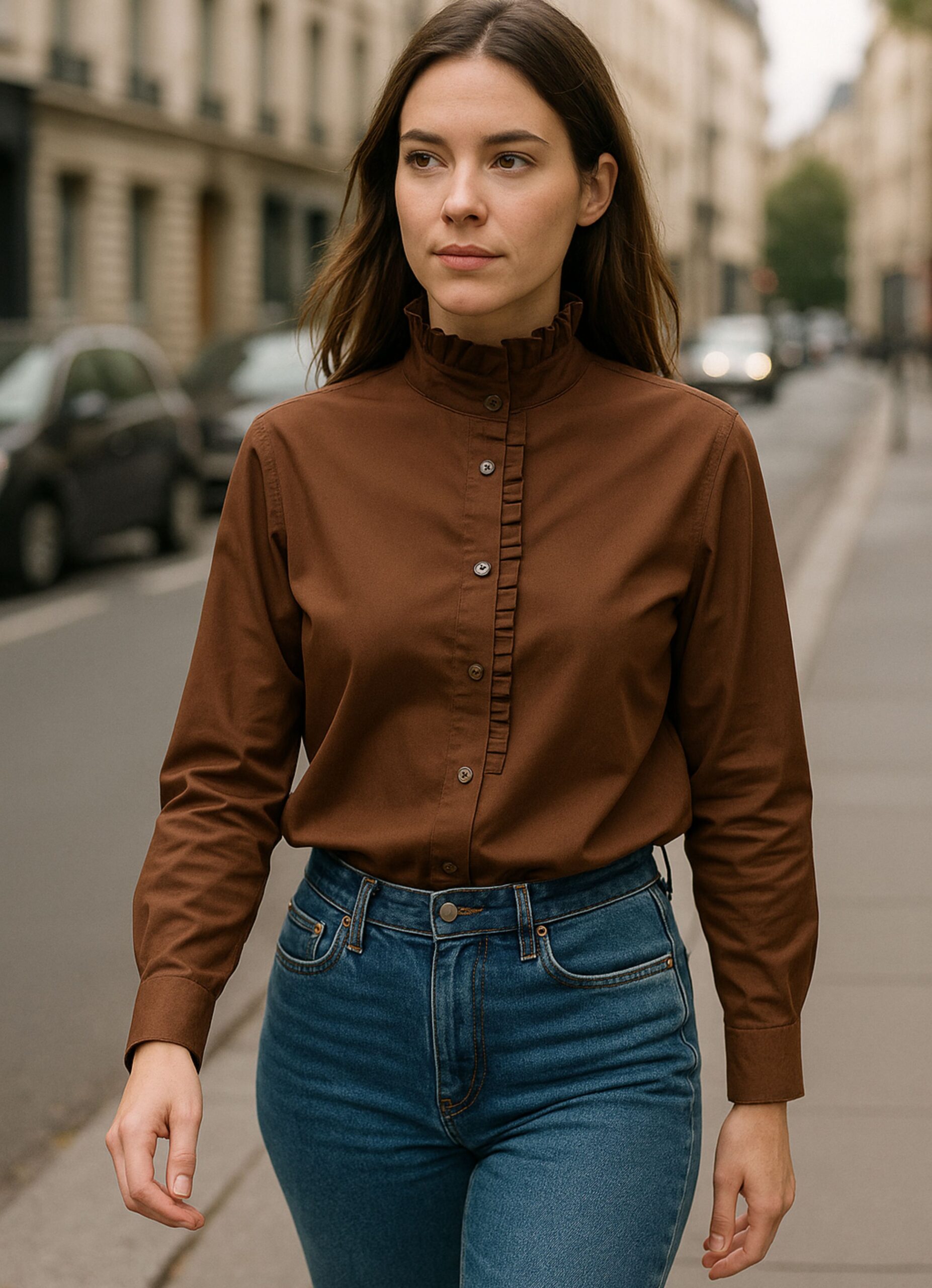 Piękna brązowa koszula , dłuższa, z ozdobnym kołnierzem i zaokrąglonym dołem.