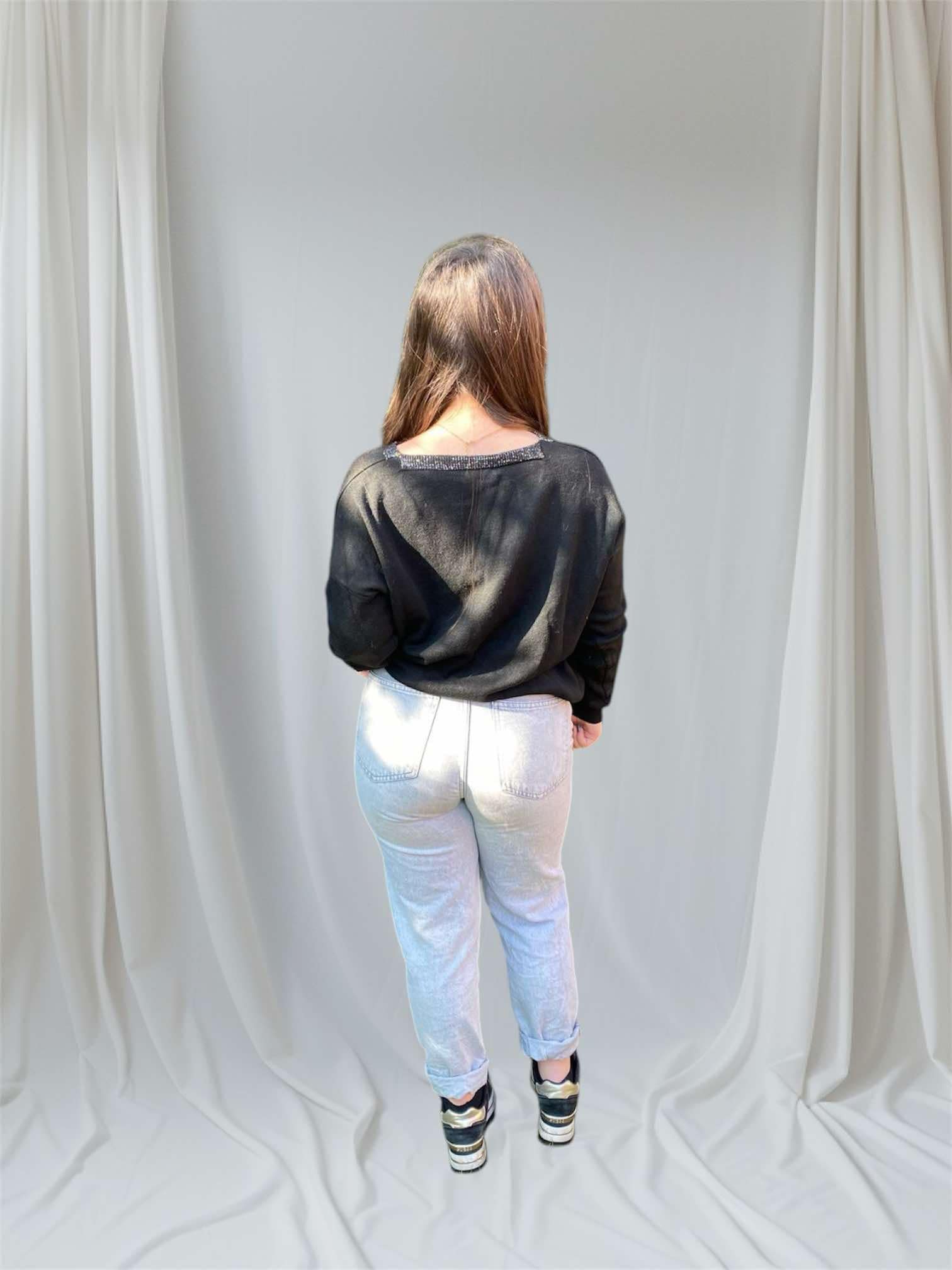 Czarny sweter z aplikacją w złotych odcieniach. Starannie wykończony, dekolt w szpic ze srebrną nitką. Pasuje do wielu stylizacji, rozciąga się, bardzo dobra jakość.