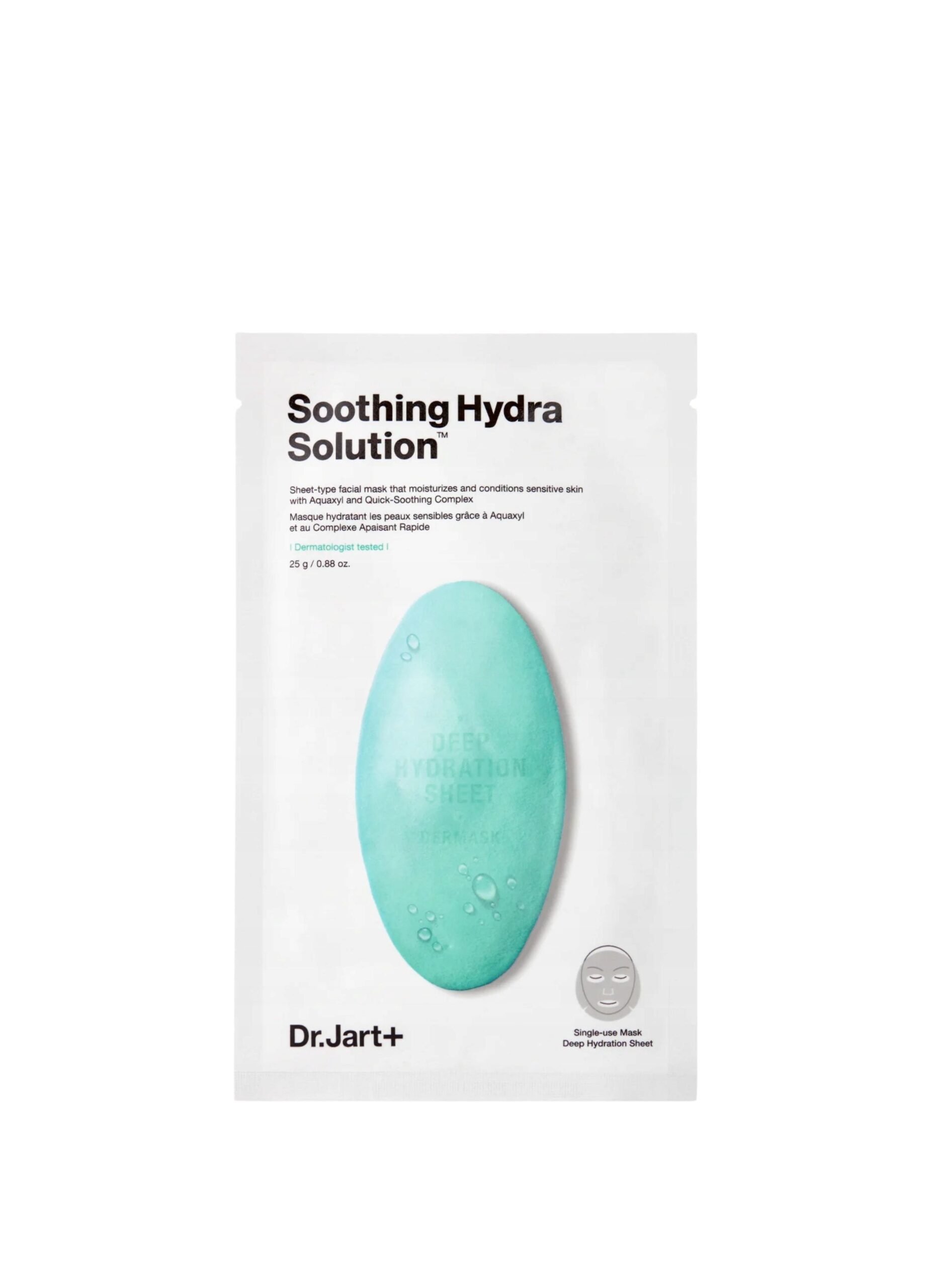 Dr.Jart+ Soothing Hydra Solution to intensywnie nawilżająca i kojąca maska w płachcie, która natychmiast łagodzi podrażnienia, redukuje zaczerwienienia i przywraca komfort skórze. Jej bogata formuła została stworzona z myślą o skórze suchej, wrażliwej oraz osłabionej barierze ochronnej.