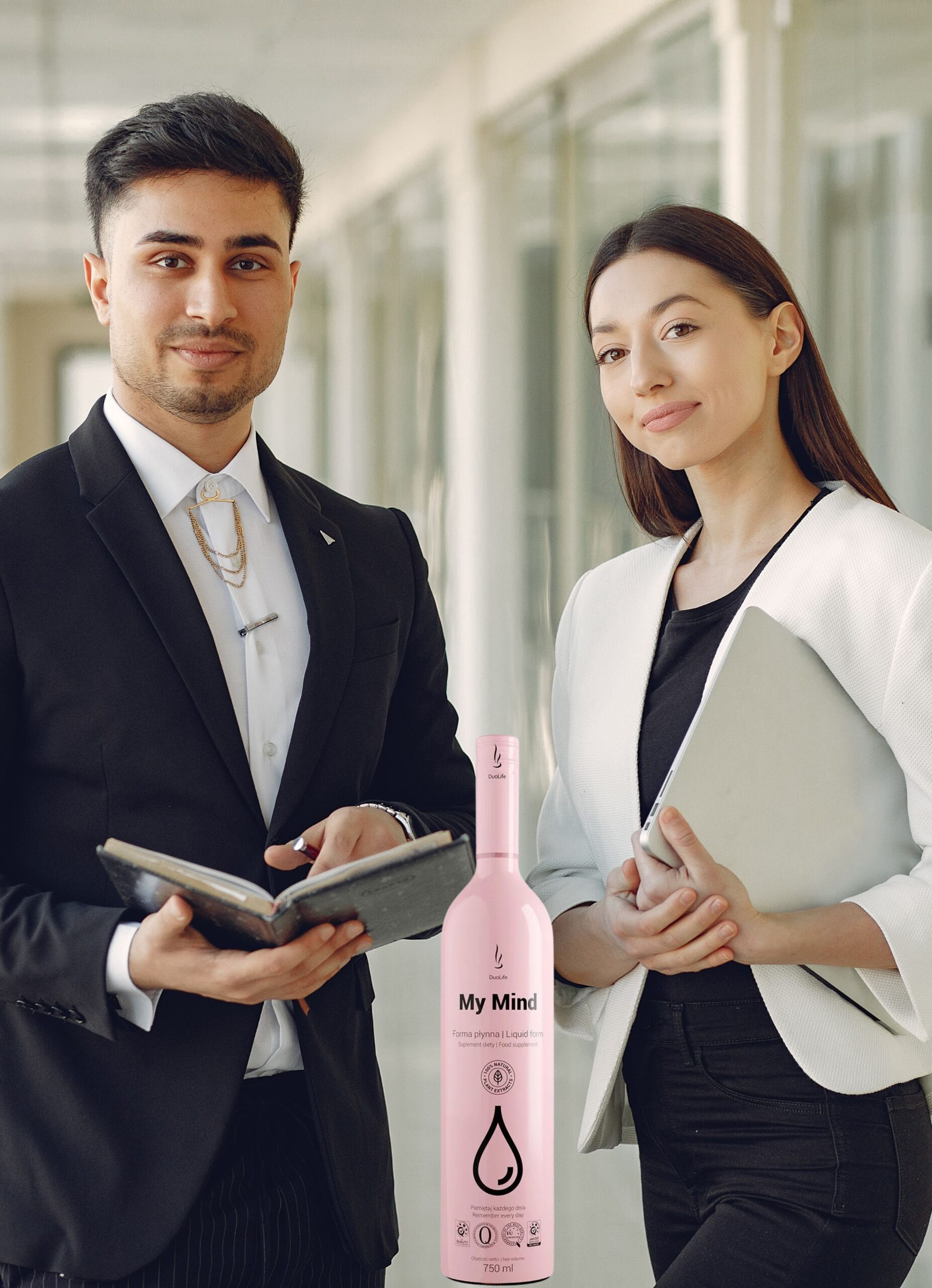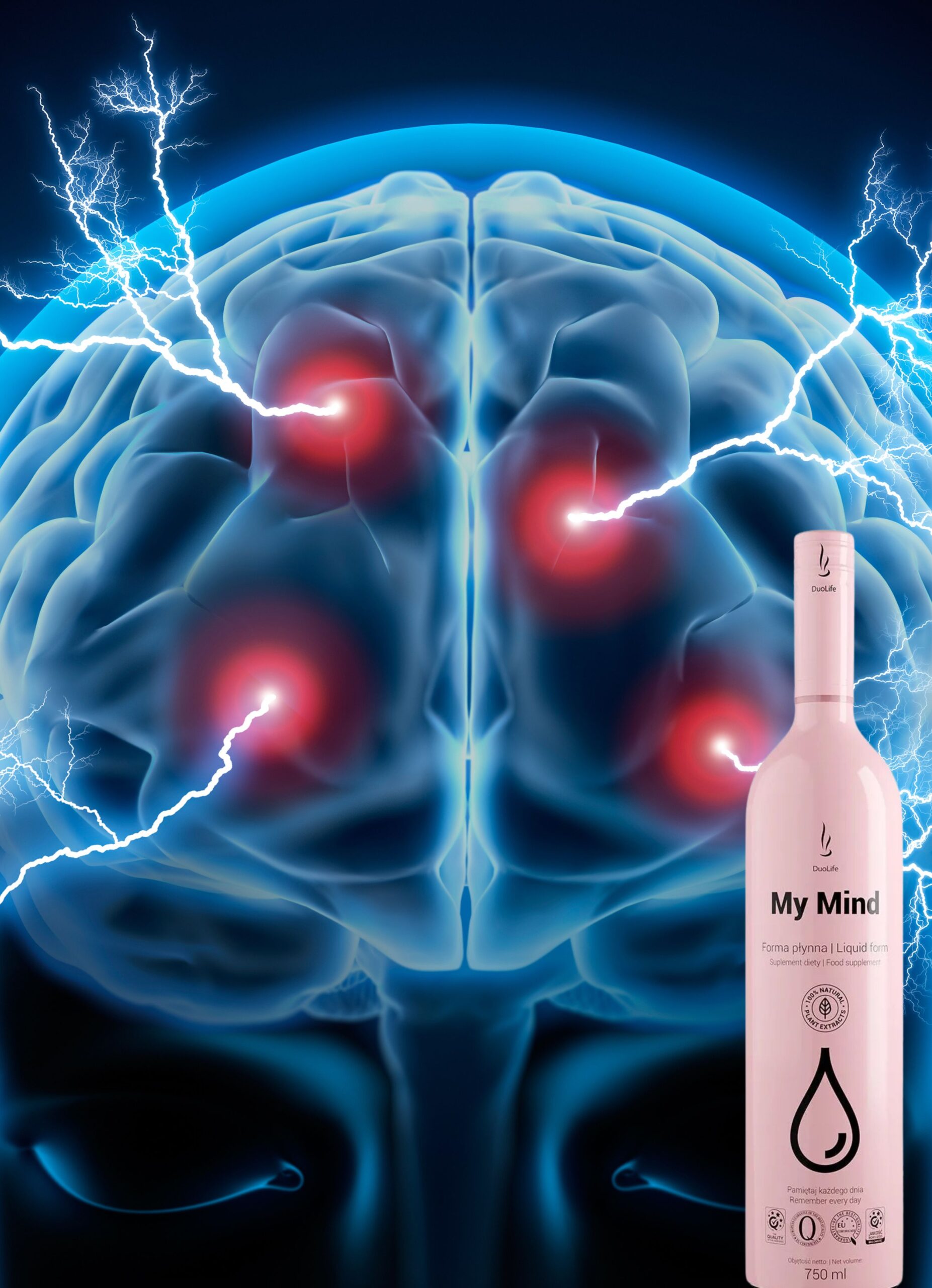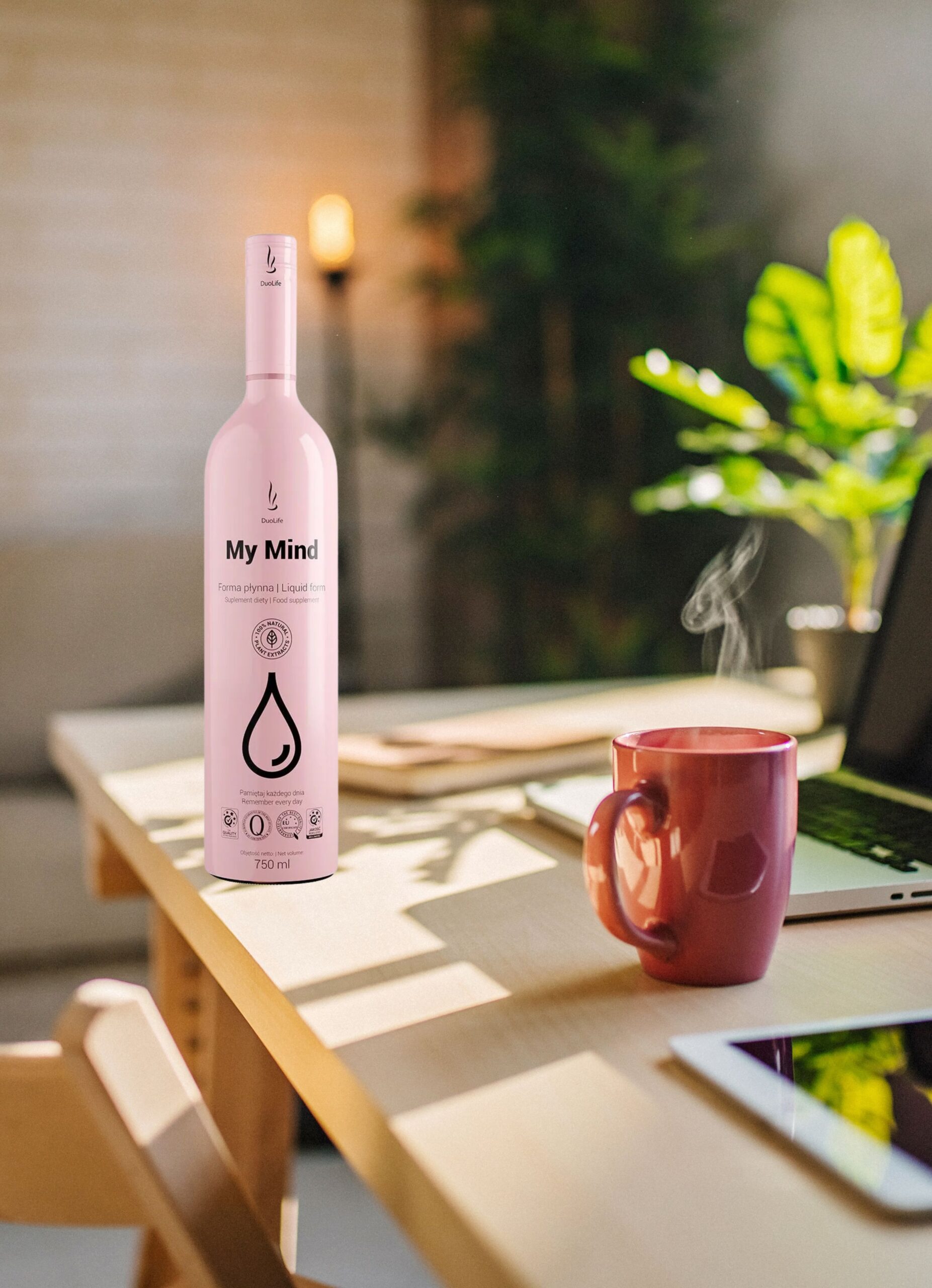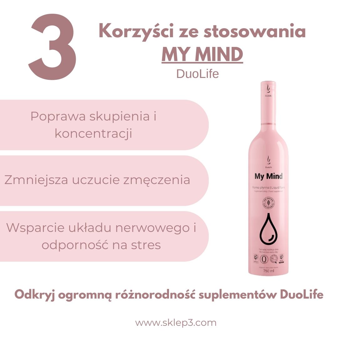 DuoLife My Mind to suplement diety w formie płynnej, stworzony z najwyższej jakości składników roślinnych. Zawiera opatentowane formuły Cognivia™, Aronvit® i MecobalActive® (witamina B12), a także inozytol i ekstrakty z m.in. miłorzębu japońskiego, różeńca górskiego, bakopy i cytryńca chińskiego.