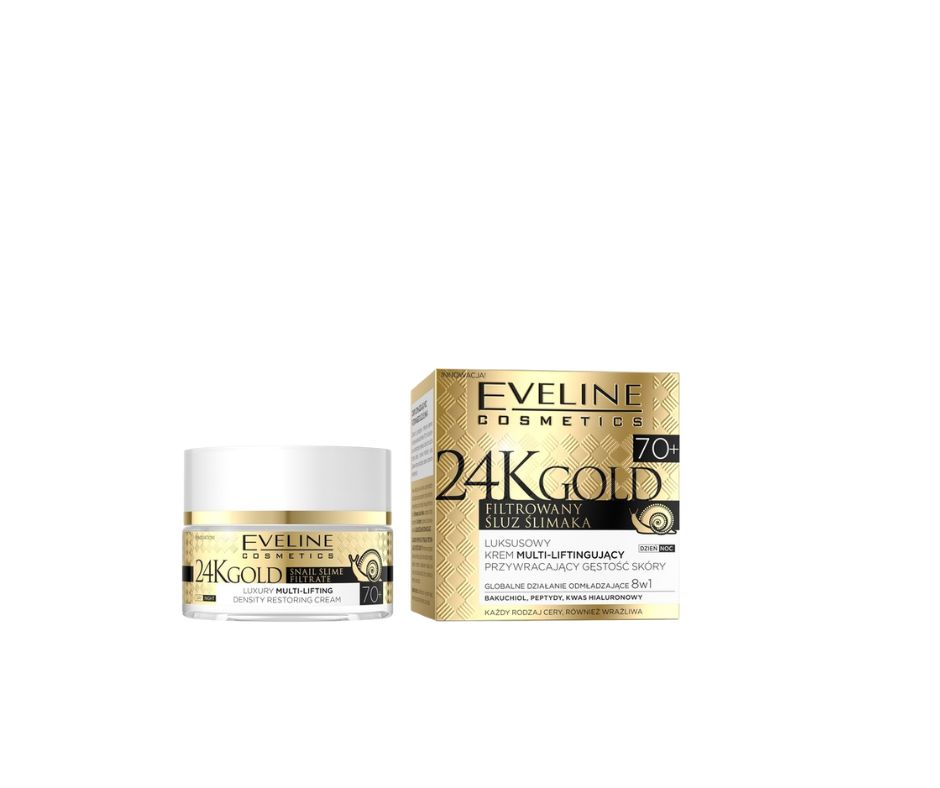 Eveline Cosmetics Luksusowy Krem Multi-Liftingujący 24K Gold 70+ to ekskluzywny krem przeciwzmarszczkowy stworzony specjalnie z myślą o wymagającej pielęgnacji skóry dojrzałej. Zaawansowana formuła łączy nowoczesne osiągnięcia kosmetologii z luksusowymi składnikami aktywnymi, zapewniając kompleksowe działanie odmładzające i regenerujące.