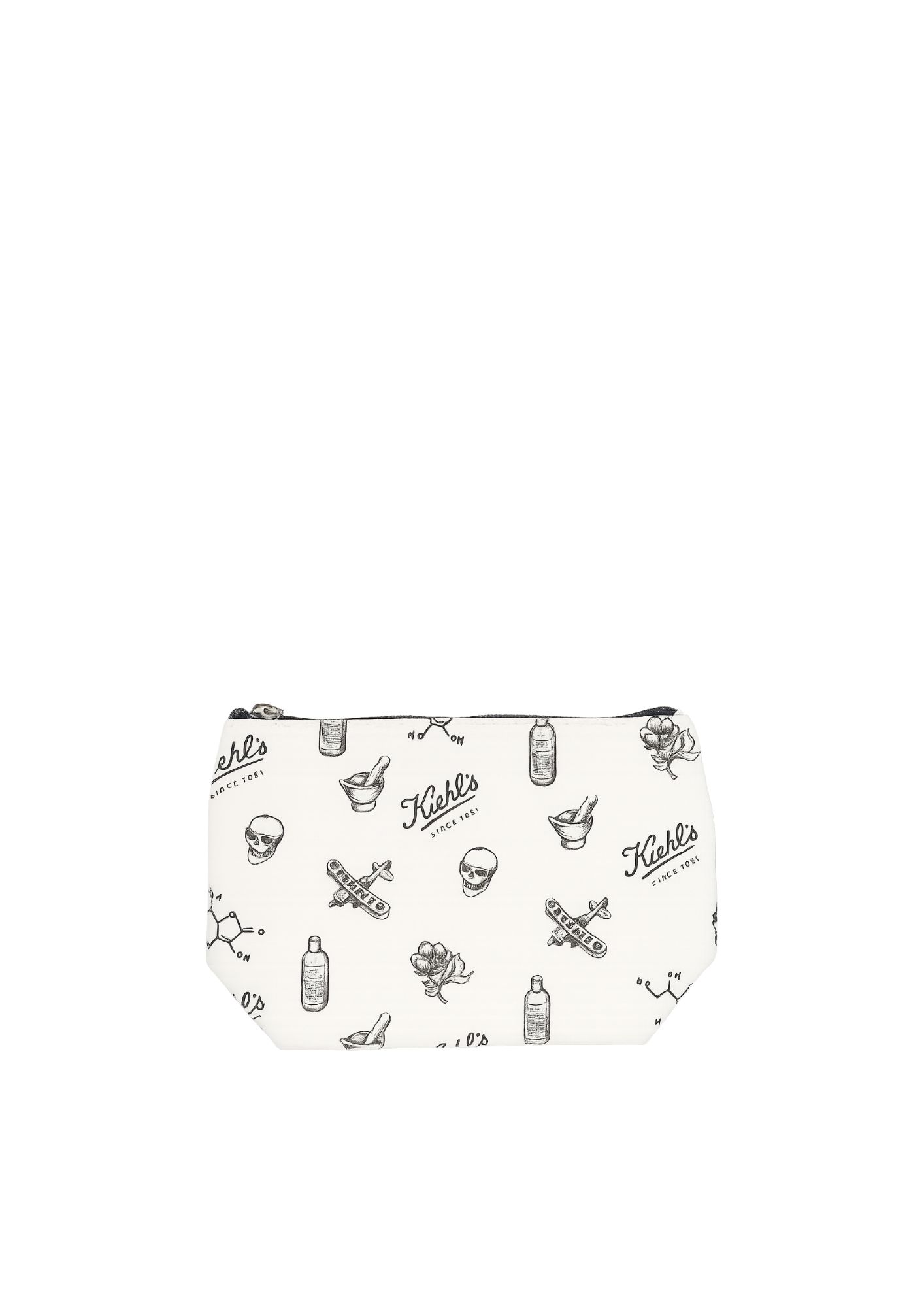 Stylowa i praktyczna kosmetyczka od marki Kiehl’s, zaprojektowana z myślą o miłośnikach pielęgnacji oraz wyjątkowego designu. Wykonana z wysokiej jakości materiału, ozdobiona czarno-białym nadrukiem w stylu retro, nawiązującym do aptekarskiego dziedzictwa marki. Na kosmetyczce znajdują się ilustracje takie jak logo Kiehl’s, symbole chemiczne, flakoniki, moździerze, róże oraz klasyczne motywy vintage.
