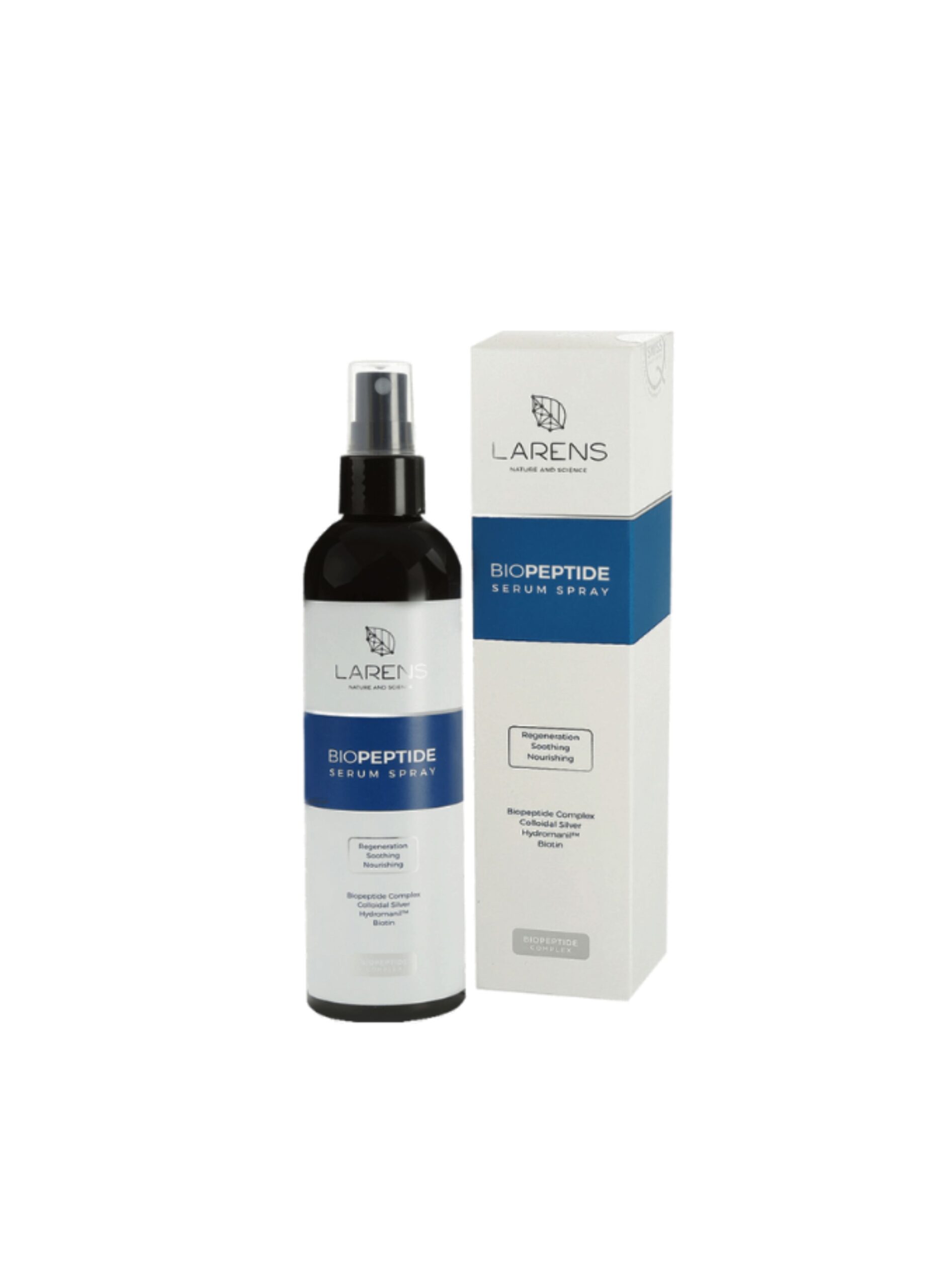 Wielofunkcyjne serum peptydowe marki Larens oparte na unikalnej formule Biopeptide Complex oraz wodzie Nutrivi. To zaawansowany kosmeceutyk o wszechstronnym działaniu pielęgnacyjnym, przeznaczony do stosowania na twarz, ciało oraz włosy.
