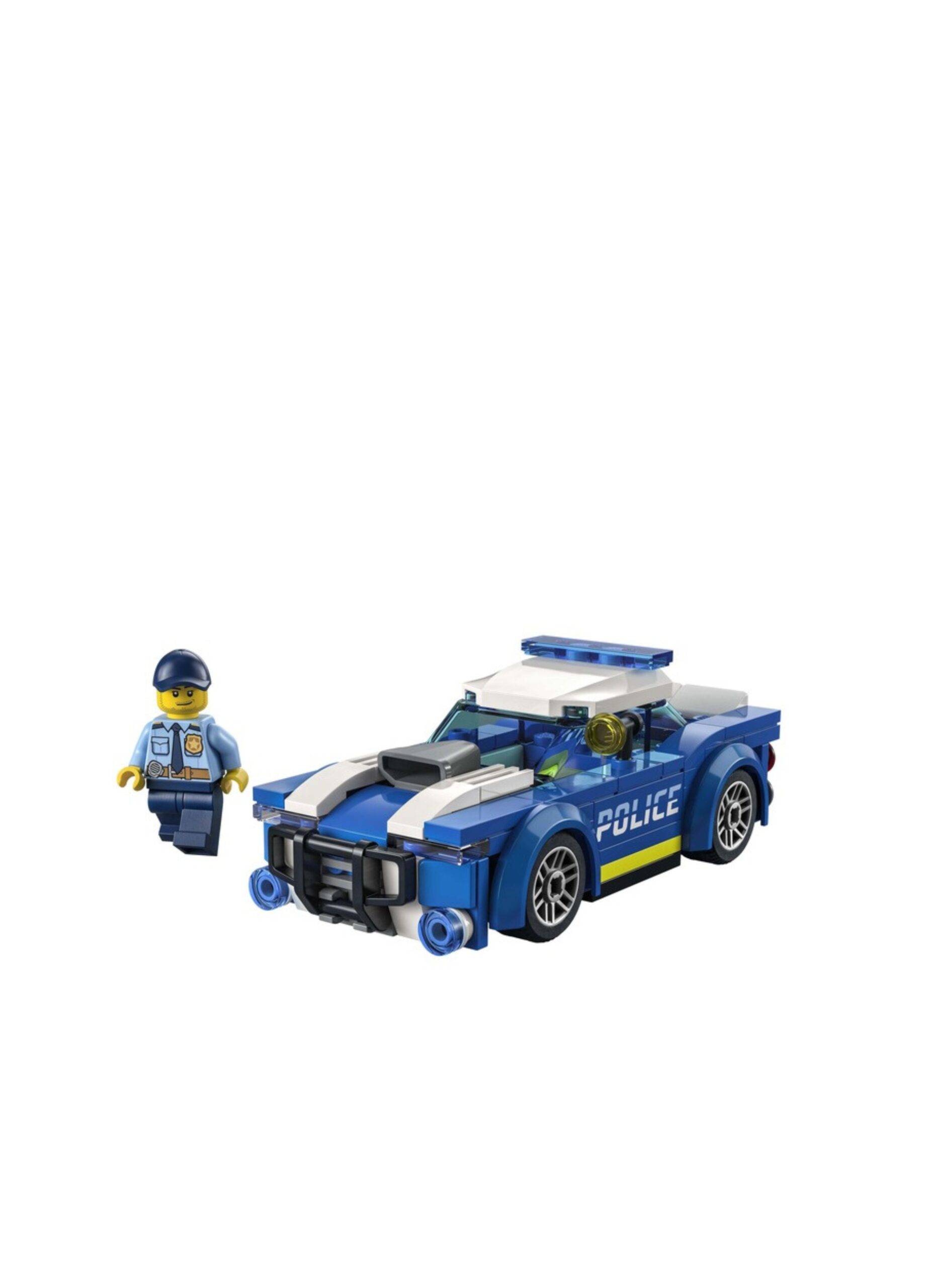 Komplet do zabawy – w opakowaniu znajduje się wszystko, czego potrzeba do zbudowania radiowozu oraz minifigurka policjanta z latarką i czapką.