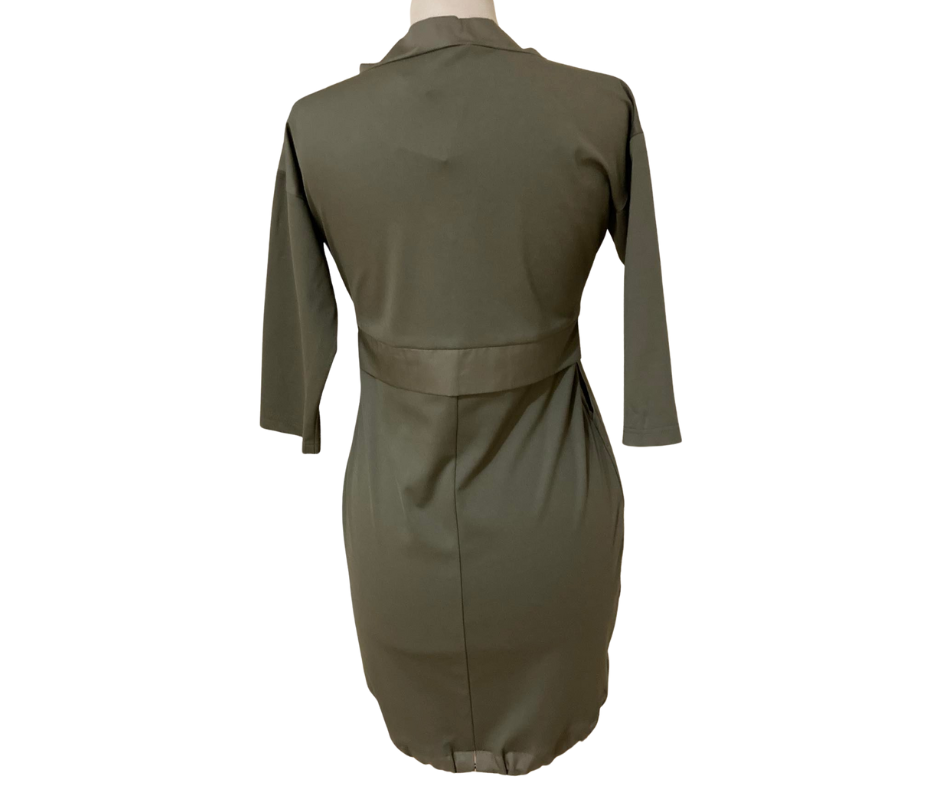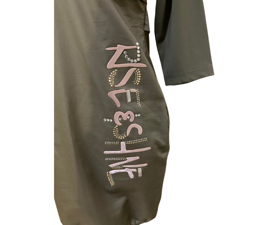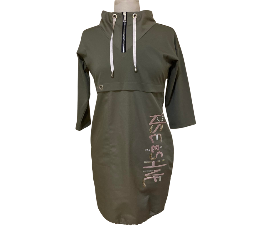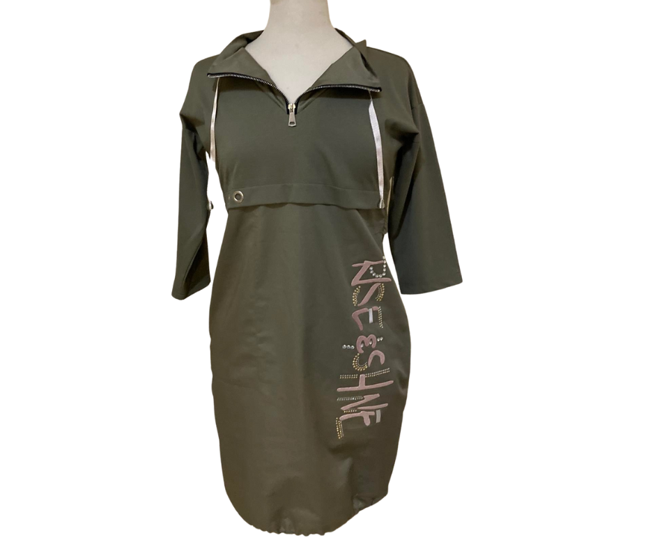 Sukienka, o kroju delikatnej bombki, z bardzo nowoczesną aplikacja. Niepowtarzalny wzór i kształt sukienki. Sukienka posiada jedną kieszeń, dekolt na zamek i delikatny ściągacz na dole sukienki.
