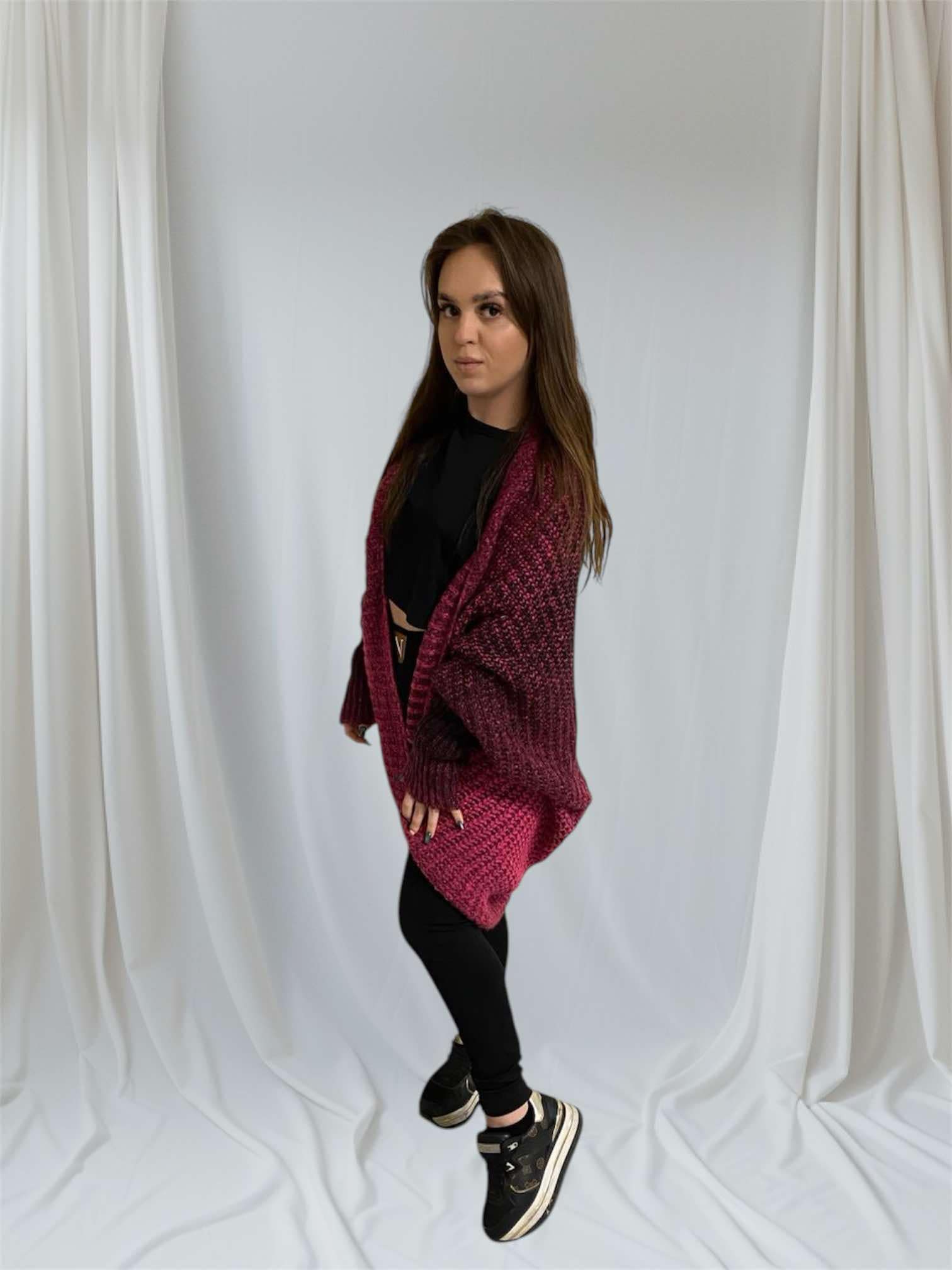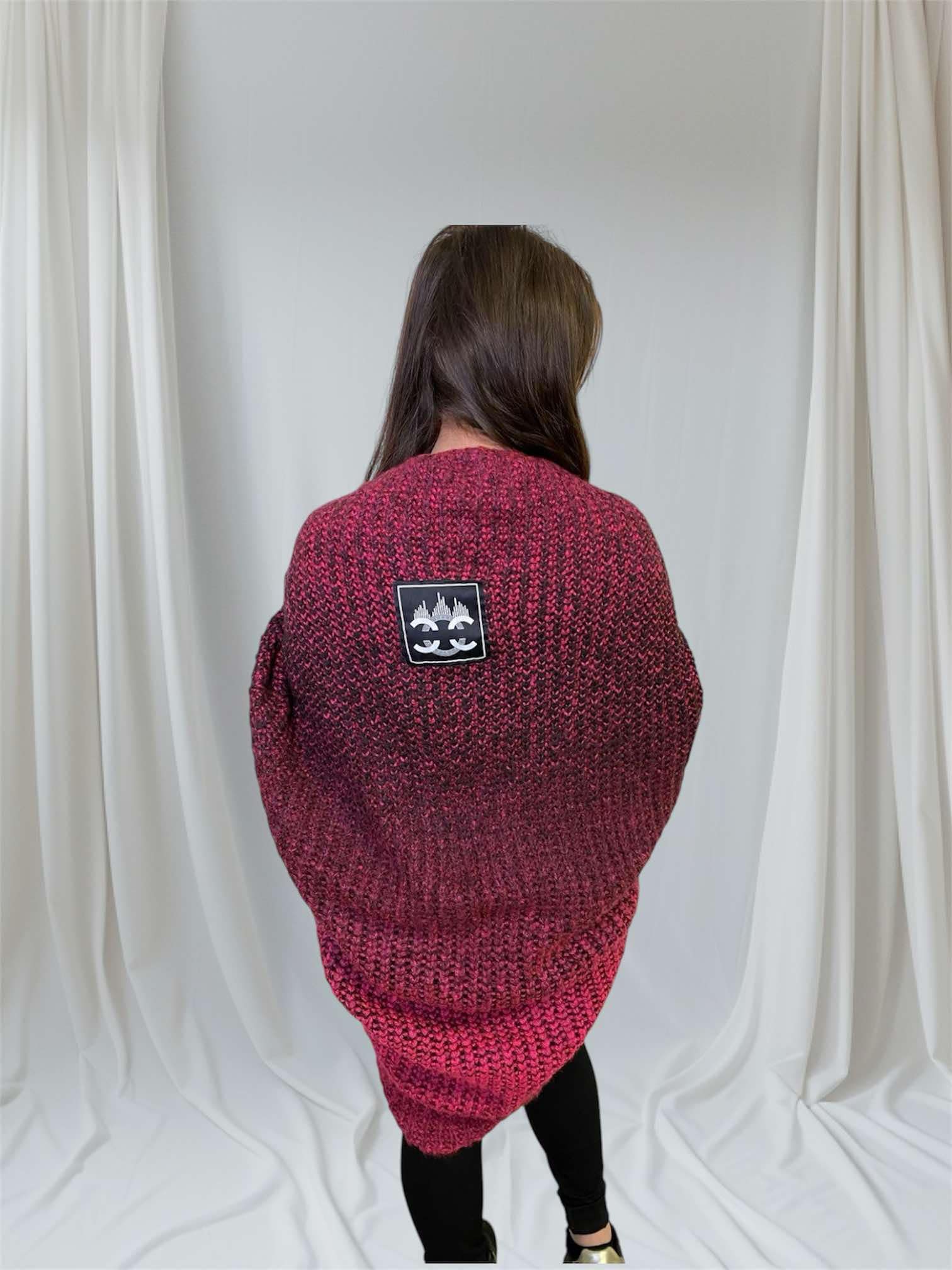 Sweter różowy, r. uniwersalny, sweter typu „jajo cieniowany, z ozdobną plakietką na plecach. Bardzo ciepły i efektowny.